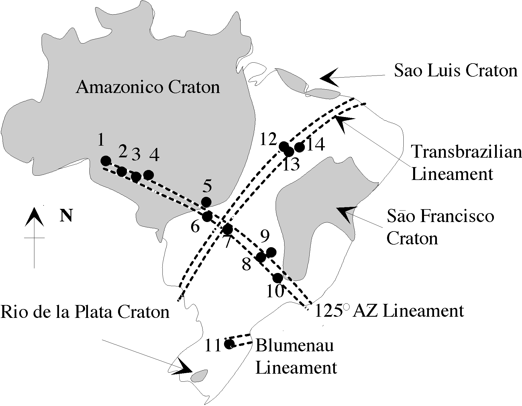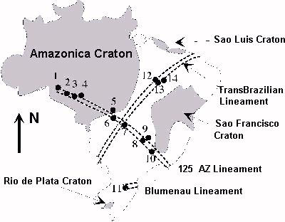 Figure 2 Principal Structural features of the Geology of Brazil Kimberlite / lamproite provinces: 1 - Ariquimes, 2 - Pimenta Buemo, 3 - Vilheno, 4 - Aripuana Juina (São Luiz), 5 - Paranatinga, 6 - Poxoreu, 7 - Amorinopolis, 8 - Alto Paranaiba, 9 - Presidente Olegario, 10 - Bambui, 11 - Lajes, 12 - Redondao, 13 - Santa Filomena-Bom Jesus, 14 - Picus. After Tompkins (1992) |
