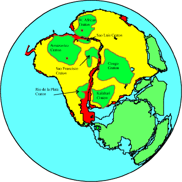 Figure 3 Reconstruction of the African and S. American plates at 144 Ma. Reconstruction shows that the Amazonica, São Luis and W. African Cratons appear to have been initially part of a single body. The locations of São Luiz and S. E. Guinean alluvial diamond deposits are indicated by black dots on the Amazonica and W. African Cratons respectively. Craton locations from Dawson (1980) and Tompkins (1992). Construction by the computer programme GLG-Plates (Ford, C. E., University of Edinburgh, 1995) using an orthorhombic projection and viewing down -50° Latitude, -5° Longitude. |