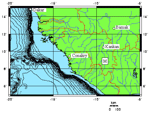 Figure 1 Geographical location map of Guinea and some of the diamond deposits of the S.E. M - The drainage area of the Mandala Basin and source of diamonds described by Sutherland (1993). Map created at the Online Map facility, Kiel (http://www.aquarius.geomar.de/omc/), Wessel and Smith (1995) |